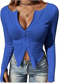 Womens Long Sleeve Tops Ribbed Crop Top Double Zip Up Cardigans V Neck Sweater Shirts Fall and Winter 2024
