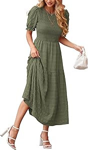 Womens Summer Dresses 2025 Casual Puff Short Sleeve Crewneck Smocked Flowy Ruffle Boho Beach Party Maxi Sundress