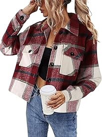 Womens Cropped Plaid Shacket Flannel Long Sleeve Button Down Jackets Coat for Women